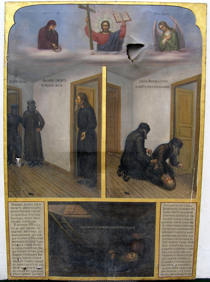 31 октября 1913 года на квартиру архимандрита Аверкия в Пуциловском миссионерском стане явились два молодых корейца, скрывавшие свои лица под масками. Не говоря ни слова, они сбили старца с ног и, схватив за горло, стали душить.