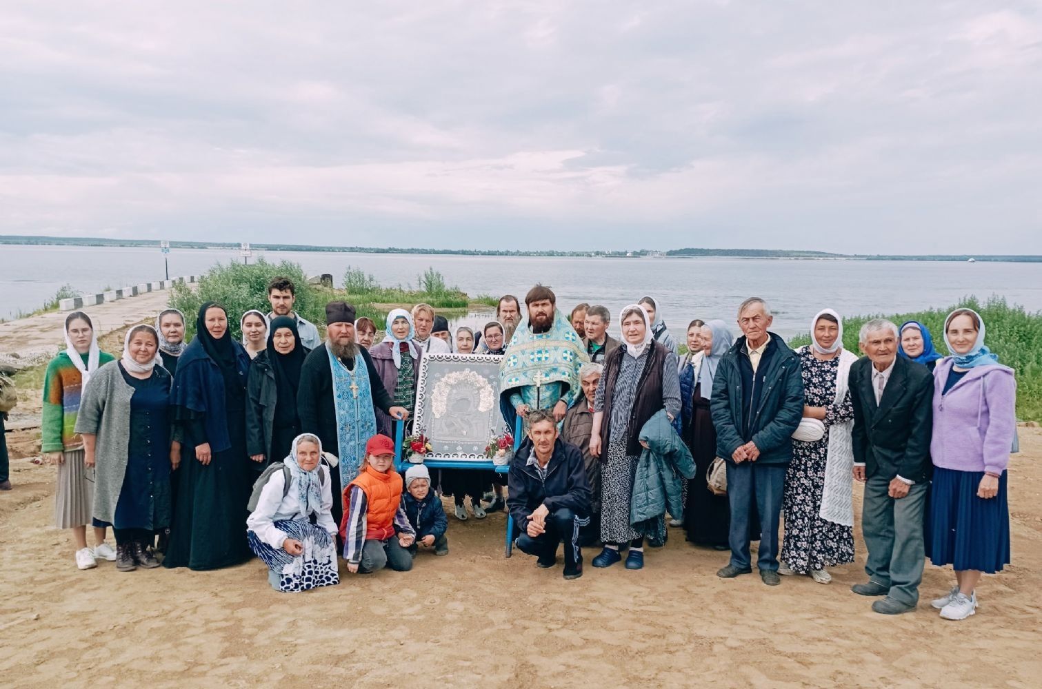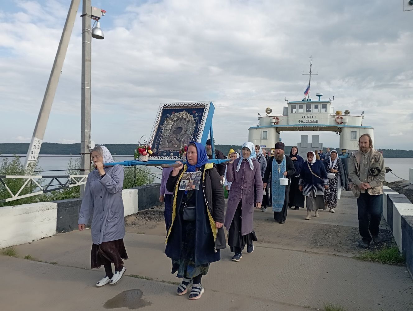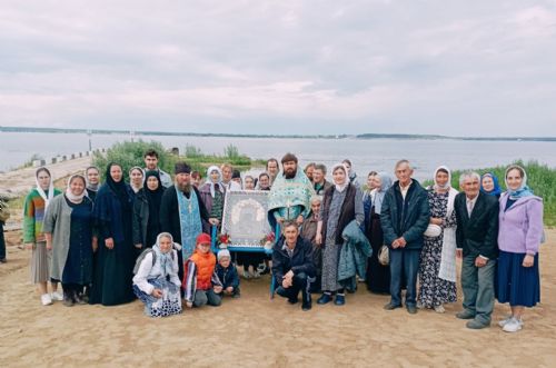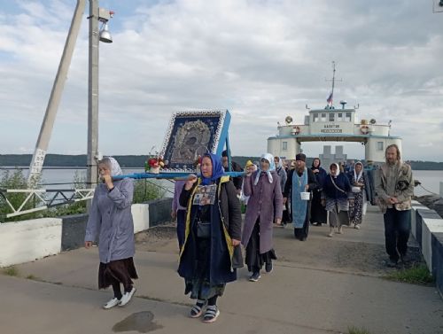 Далее верующие обошли с Владимирской иконой крестным ходом вокруг храма и с молитвами двинулись на берег Волги. Здесь они погрузились на паром и переправились на другую сторону – к поселку Юрино, где их радостно встретили прихожане Михаило-Архангельского храма во главе с настоятелем протоиереем Николаем Барсуковым.