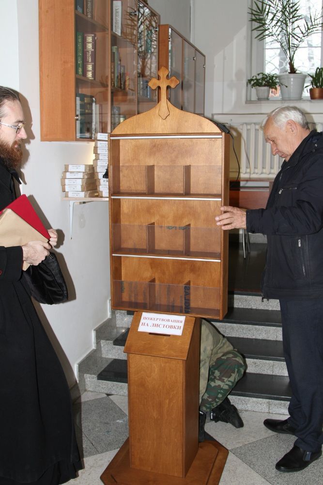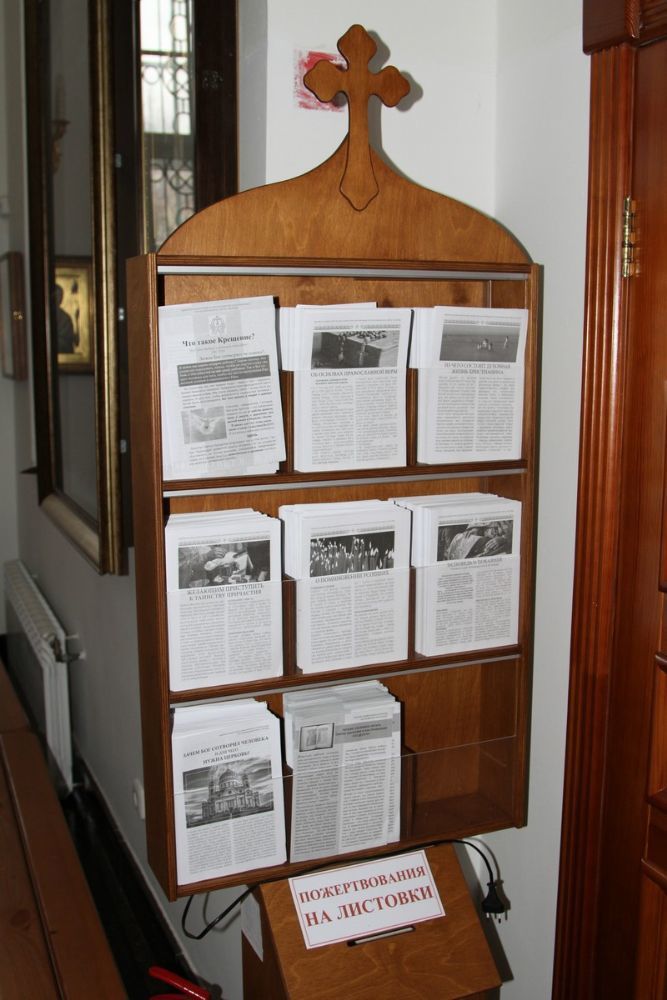 На текущей неделе стенды были установлены во всех храмах города. Теперь все прихожане имеют возможность взять просветительские листовки как для себя, так и поделиться ими со своими родными и коллегами. Желающие внести свою лепту в миссионерский проект могут сделать пожертвование на печать листовок – у каждого стенда имеется специальный ящик. Каждые полгода тематика листовок будет обновляться.