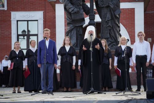 На открытой площадке на набережной Кокшаги у памятника святым Кириллу и Мефодию собравшихся приветствовал митрополит Йошкар-Олинский и Марийский Иоанн.