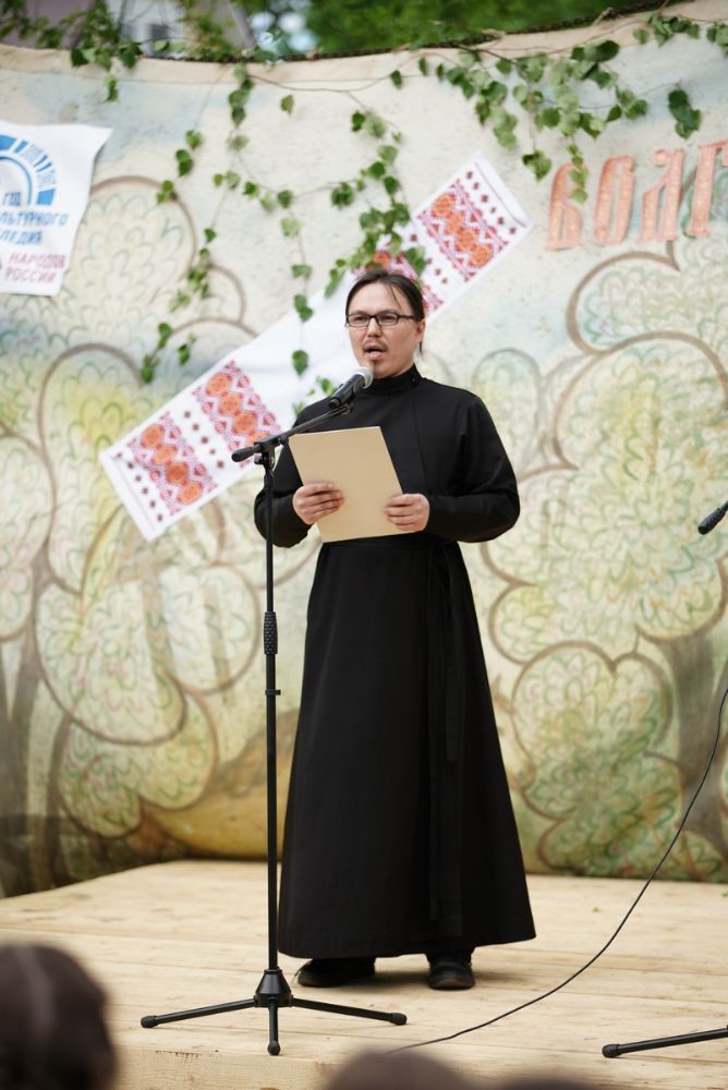 Торжественная часть праздника открылась приветственным словом благочинного Пригородного церковного округа протоиерея Николая Ярошевича. Затем сотрудник миссионерского отдела епархии диакон Димитрий Кудряшов произнес проповедь на марийском языке о смысле и значении праздника Святой Троицы и духовной жизни.