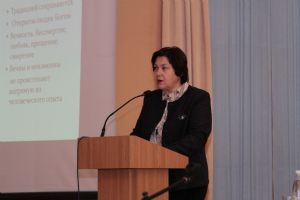 С докладом «Традиционные ценности и современный мир» выступила Елена Филиппова, руководитель регионального центра для талантливых детей «Волгенче». Елена Григорьевна отметила, что помимо традиционных ценностей, созданных человеком (культура, искусство, традиции и т.п.), есть и традиционные ценности, данные нам Богом – вера, евангельские заповеди, молитва, духовное совершенствование и т.д. Человек, жизнь которого основана на традиционных ценностях, верит в Бога, с любовью и состраданием относится к окружающим, борется с грехом и помнит, что наш земной путь – это подготовка к вечному блаженству с Господом. Если мы сохраним традиционные ценности – сохраним и Россию. Не случайно еще в 2020 году указом Президента РФ поставлена цель: создание условий для воспитания гармонично развитой и социально ответственной личности на основе духовно-нравственных ценностей народов Российской Федерации, исторических и национально-культурных традиций. А 9 ноября принят указ «Об утверждении Основ государственной политики по сохранению и укреплению традиционных российских духовно-нравственных ценностей». Главная задача – привить молодым людям стойкий иммунитет к тому безумию, которое творится в окружающем мире.